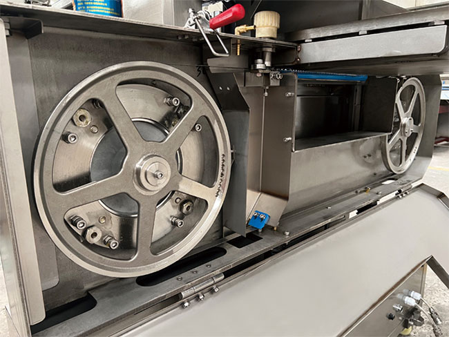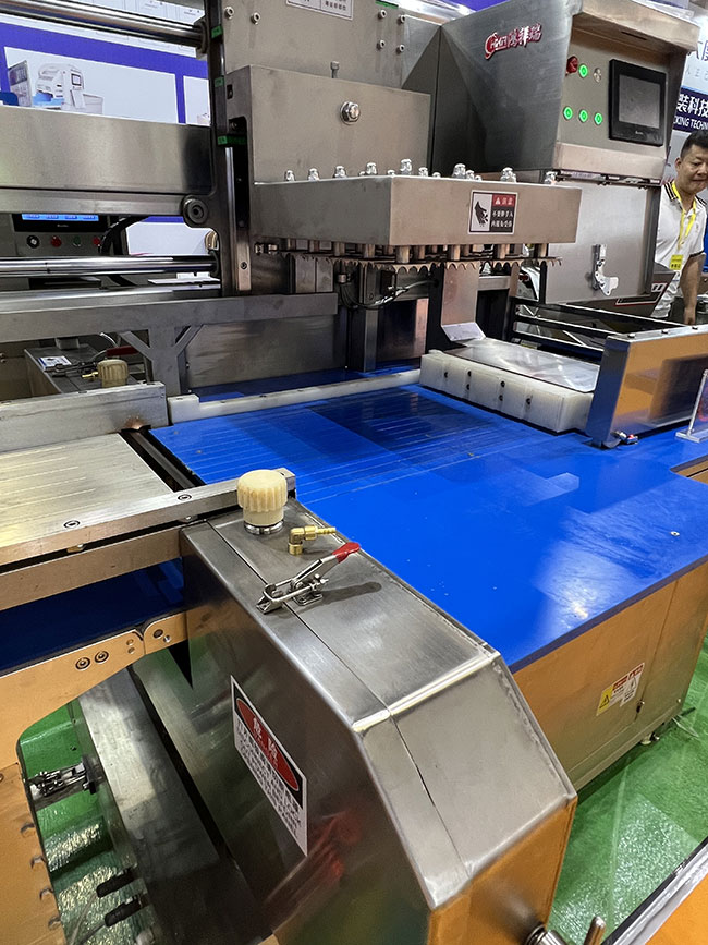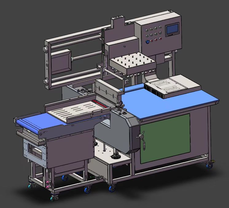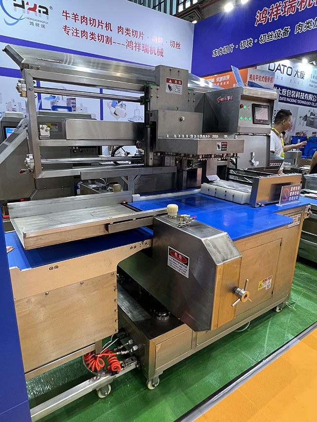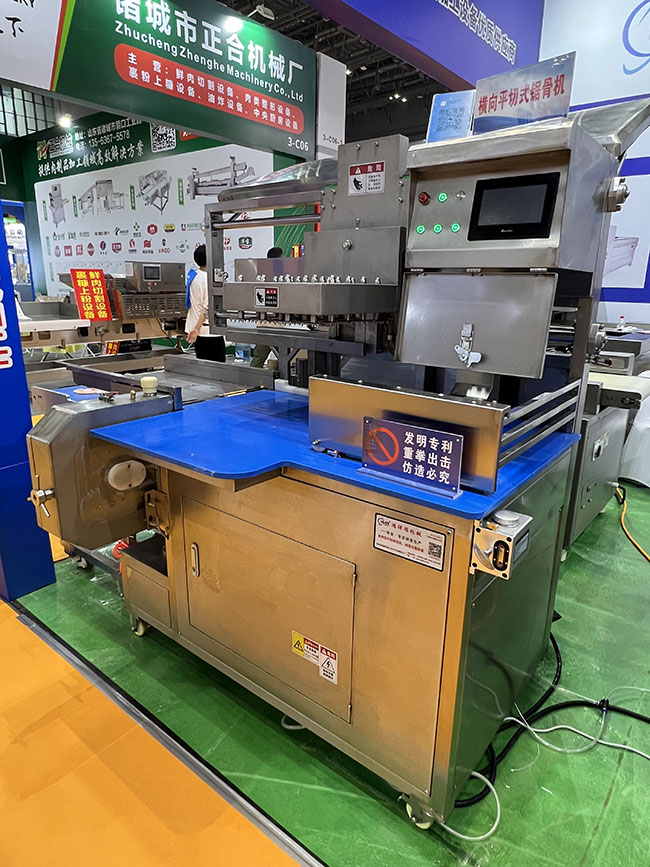 橫向平切式凍肉(骨)開片機,是我公司按照市場需求精心研發(fā)的一款骨肉類深加工切割設備。本設備已榮獲國家發(fā)明專利(專利號:202310105353)。本設備采用鋸切的方式和橫向結(jié)構(gòu),可以將﹣20℃的凍肉、骨等食材鋸切成為均勻平直且最大橫截面的片,可以極大提高后續(xù)切塊、切絲、切片等工序的成品率和成型率。本設備采用氣電組合的動力結(jié)構(gòu),整機設備由主機和氣動升降夾料輸送帶組成,放入食材原料后無需人工干預,氣動壓料,自動往復鋸切傳輸,極大提高了工作效率,保證了工作人員的安全性。開片厚度可以根據(jù)用戶需求數(shù)控調(diào)節(jié),方便快捷。整機采用SUS304不銹鋼材質(zhì),工作完成后可用高壓水槍直接沖洗和消毒處理。本設備適合用于超低溫凍肉、骨類切割,例如:冷凍大塊部位牛肉、大塊部位豬肉、調(diào)理組合禽類、脊骨、扇子骨、冷凍鱈魚等硬質(zhì)食材的橫向開片。外觀美觀大氣,是食品加工企業(yè)及食品深加工車間的優(yōu)秀選擇!